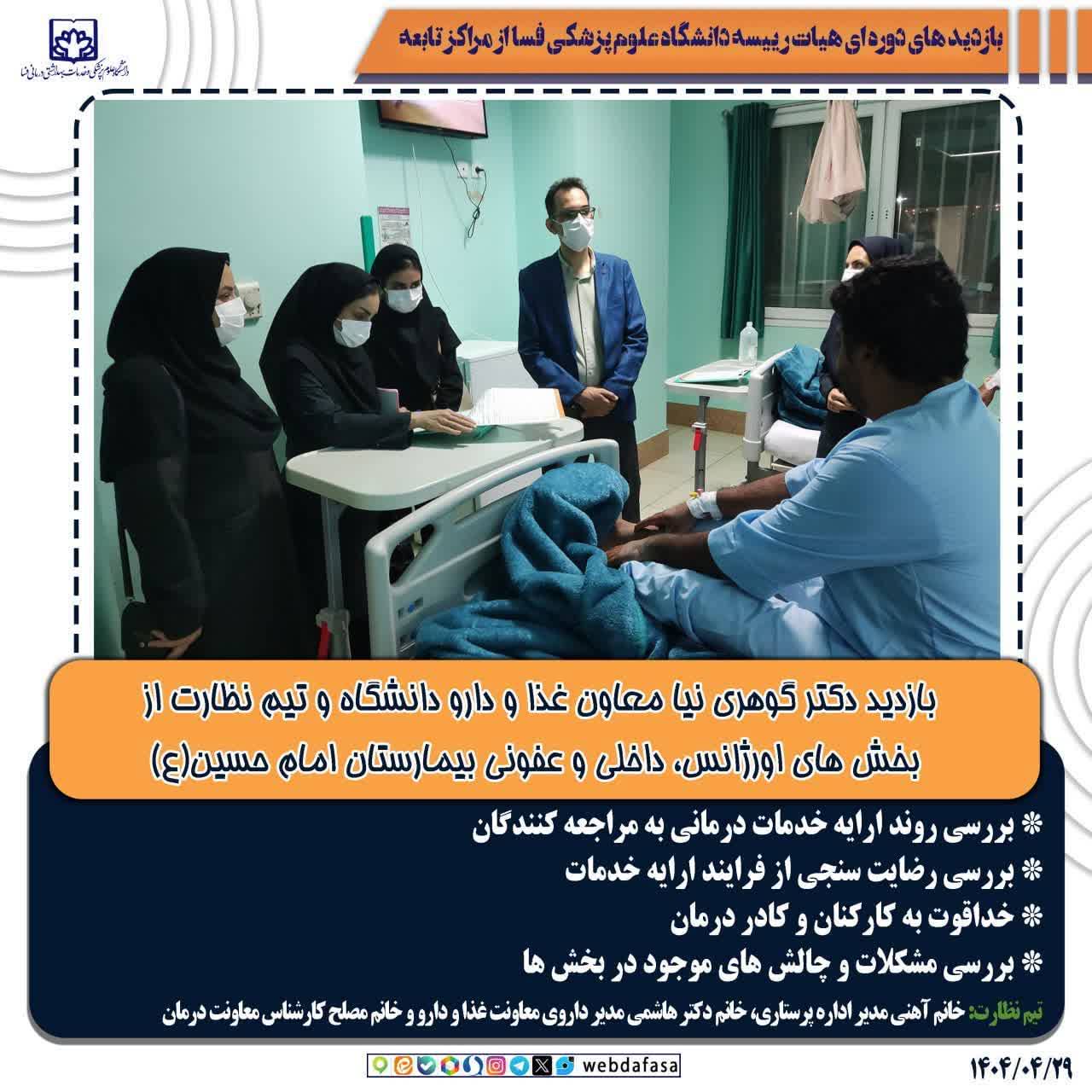 بازدید دکتر گوهری نیا معاون غذا و دارو دانشگاه و تیم نظارت از بخش های اورژانس، داخلی و عفونی بیمارستان امام حسین(ع)