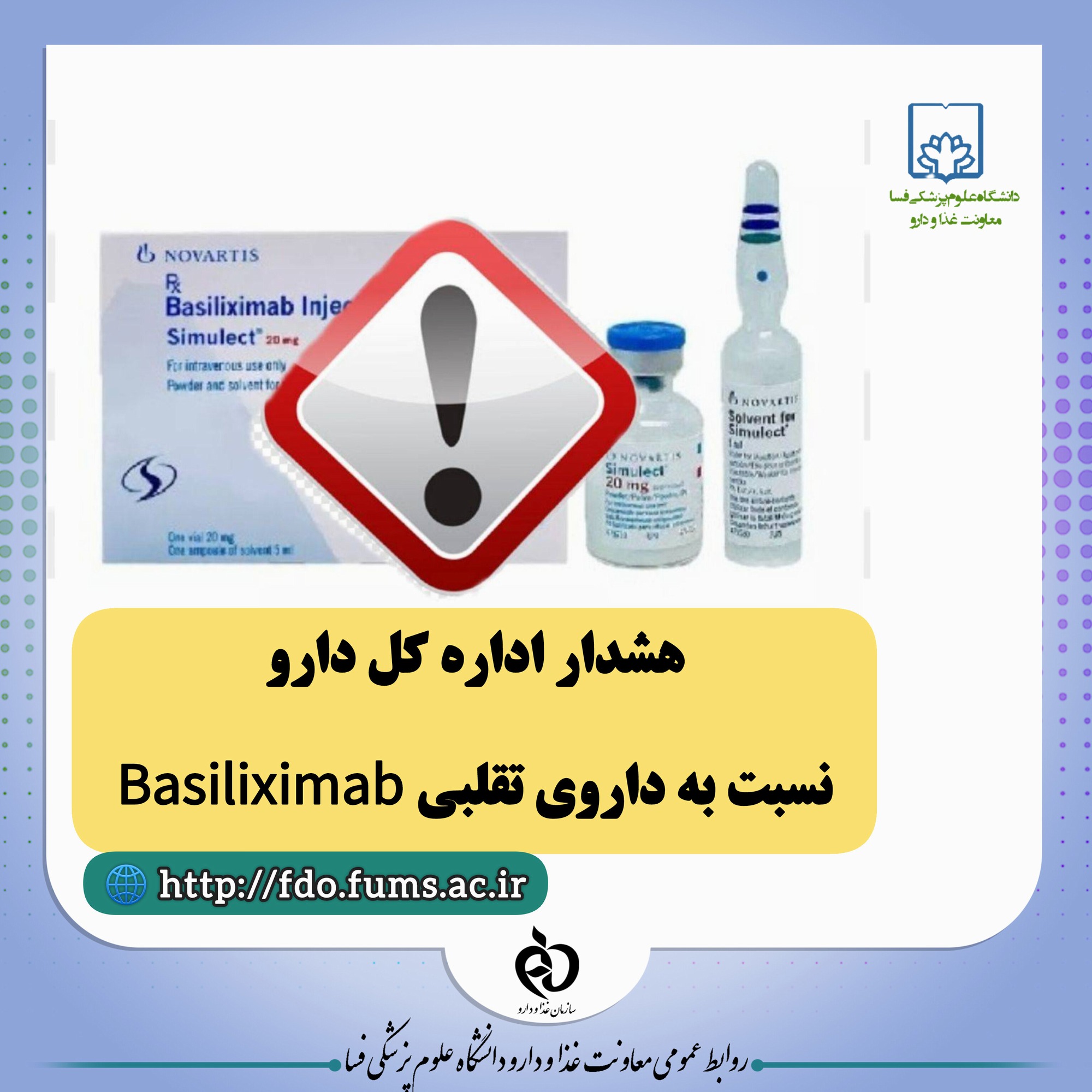 سازمان جهانی بهداشت هشدار داده است که نمونه های تقلبی داروی Basiliximab با نام تجاری SIMULECT با سری ساخت SFYD2 در برخی کشورها شناسایی شده اند.